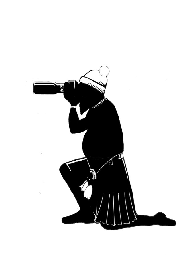 Highland Rambler, striped hat, medium camera, jumper